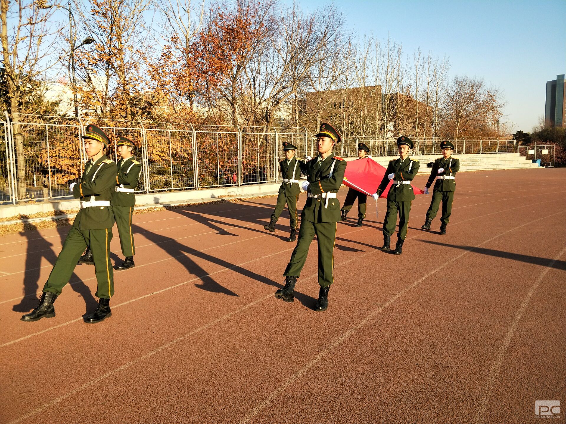 随着广播员“升旗仪式开始,出国旗”的口令,进场音乐响起,身着军装昂首挺立的升旗手们迈着坚定矫健的步伐走到升起台前,迅速地将大国旗收好,训练有素。三名升旗手在口令员的口令中走上升旗台。