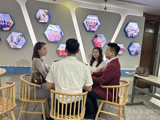 辅导员尚莲姿与毕业生陈伟交流了目前的岗位工作以及学校理论学习与公司业务的融合情况,毕业生陈伟表示,作为空中乘务专业的本科毕业生,工作优势在于对行业理论知识了解广泛,行业应用技术的学习能力较强。