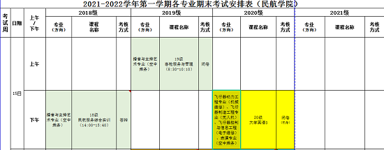 民航学院2021-2022学年第一学期各专业期末考试安排表