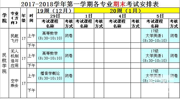 2017-2018学年第一学期民航学院各专业期末考试安排表