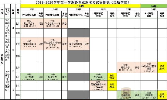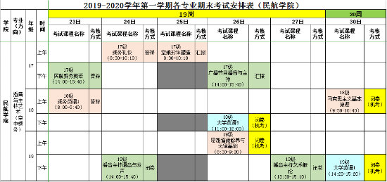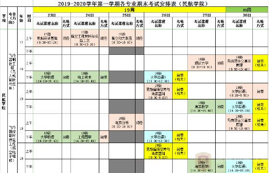 2019-2020学年第一学期各专业期末考试安排表(民航学院)